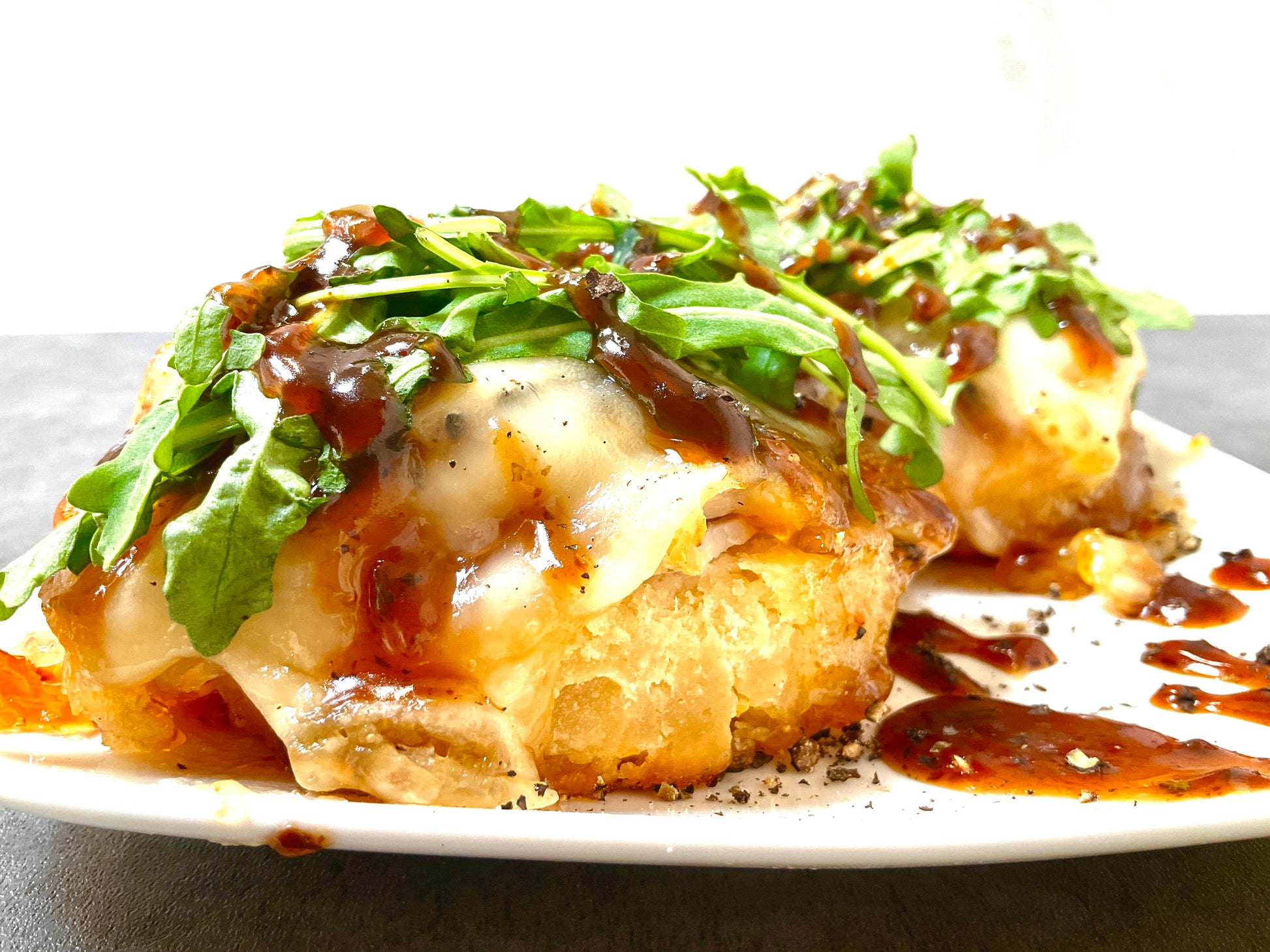 Served on a tender gluten-free buttermilk biscuit, this open-faced sandwich layers roasted turkey breast, sweet fig preserves, and melted Swiss cheese. Finished with fresh arugula, our house-made balsamic drizzle, and a touch of cracked black pepper.